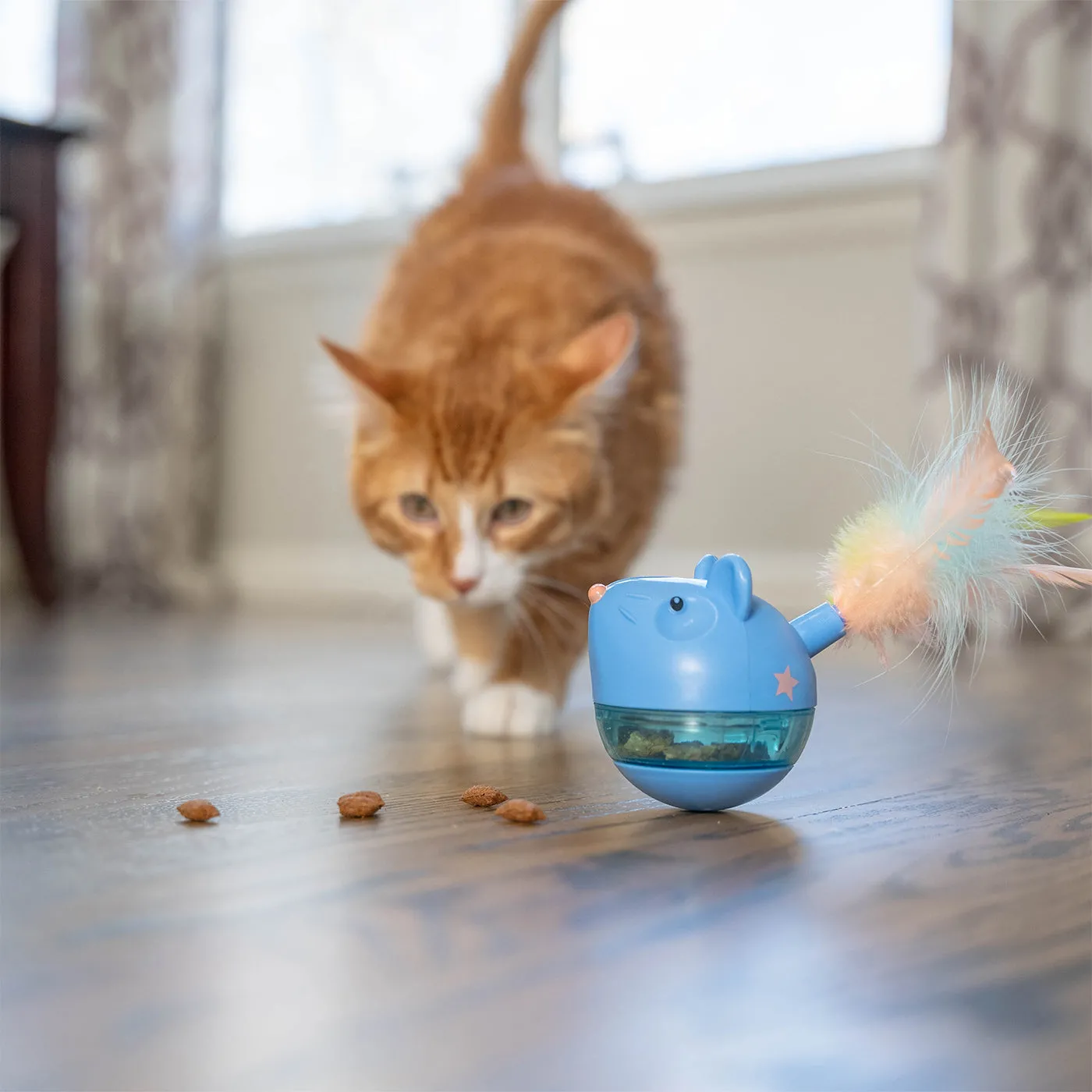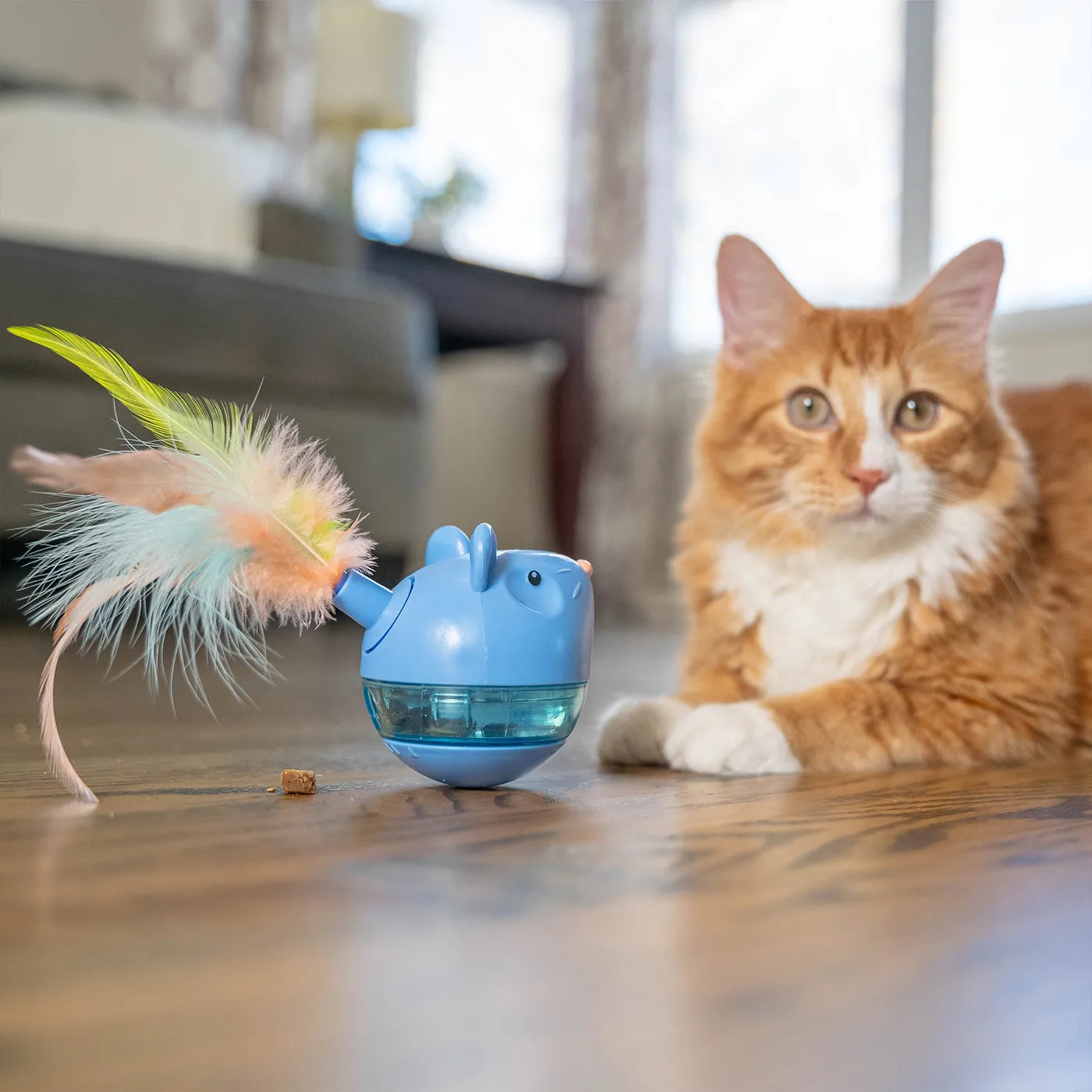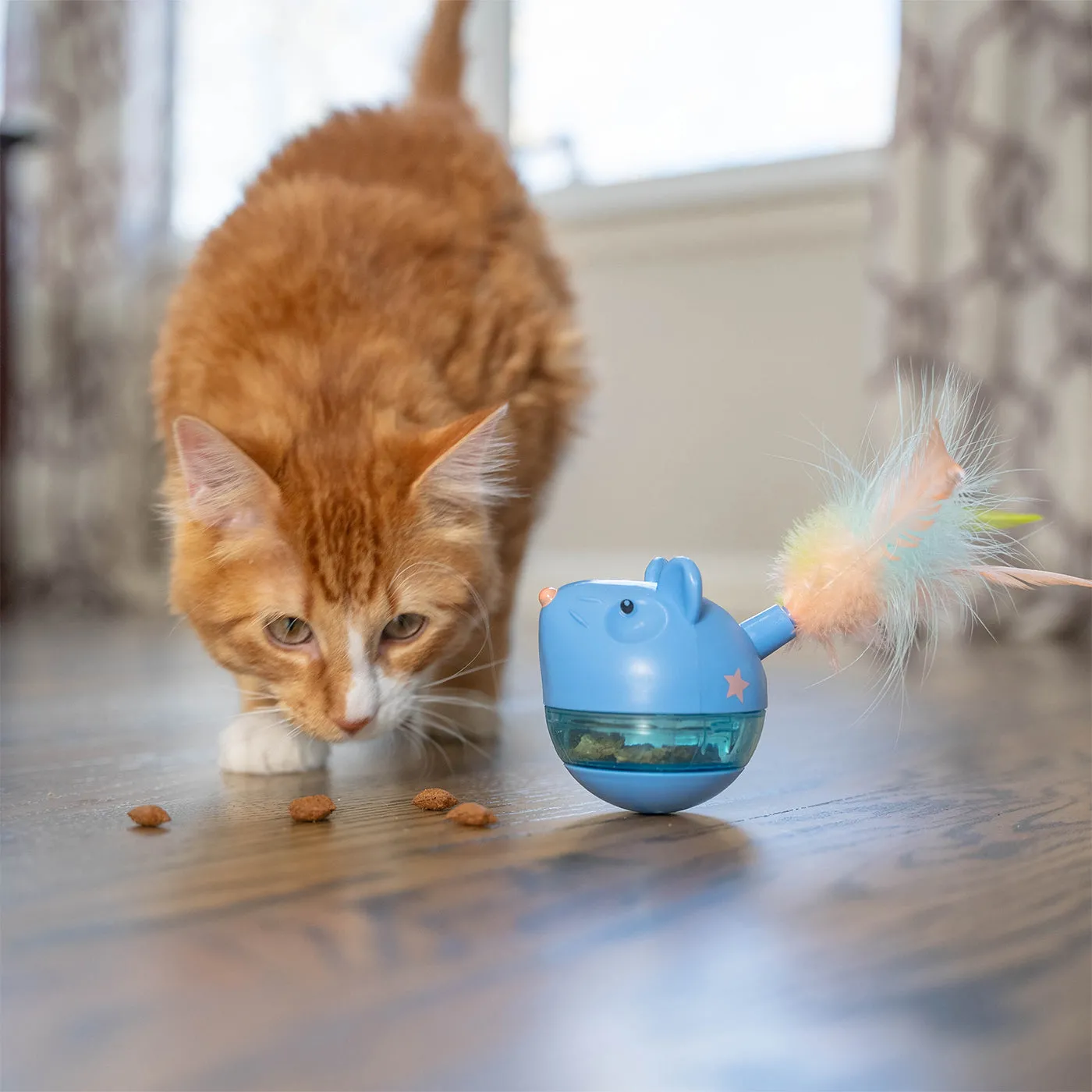 Cat treat toy that wobbles, tumbles, and rolls as cats bat and swat to release the treats